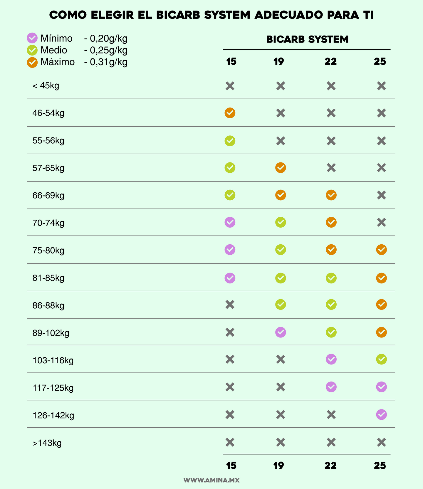 La ración correcta se calcula en función del peso de la persona y el uso que esta haya hecho del bicarbonato. Por lo general cuanto más pese, mayor será el tamaño de la ración. Sin experiencia, una mayor dosis no significa necesariamente mejor ya que hay que acostumbrarse.